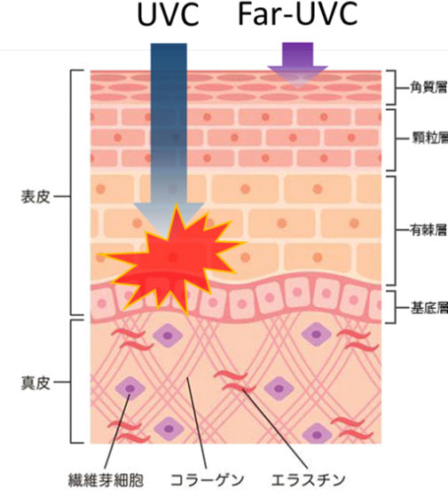 一般に、波長の短い光ほど物質に吸収されやすく、物質の内部に入り込む長さが短くなります[4]。タンパク質に吸収されやすいFar-UVCは、死細胞から成る角質層で吸収されるため、生きている細胞に到達しません。そのため、人体に影響を及ぼすことなく、表面殺菌を可能にする新たな技術として大きな注目を集めております。